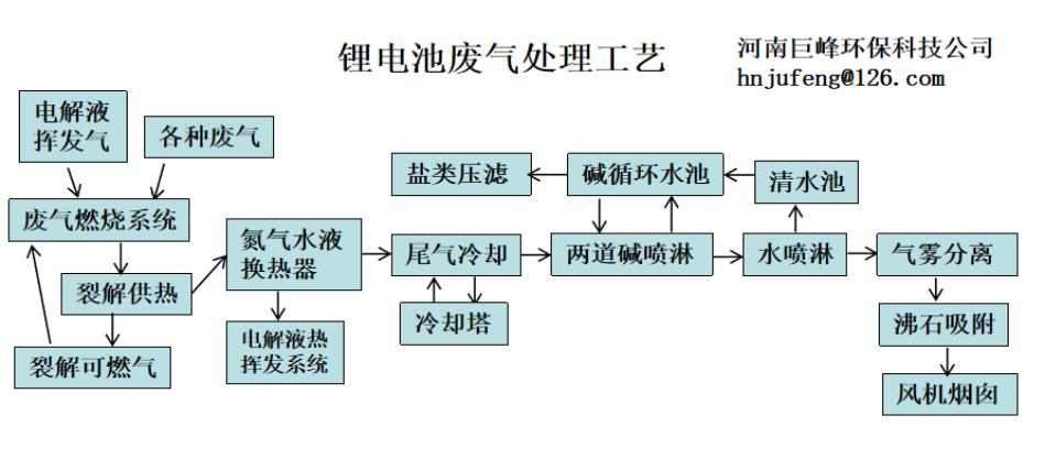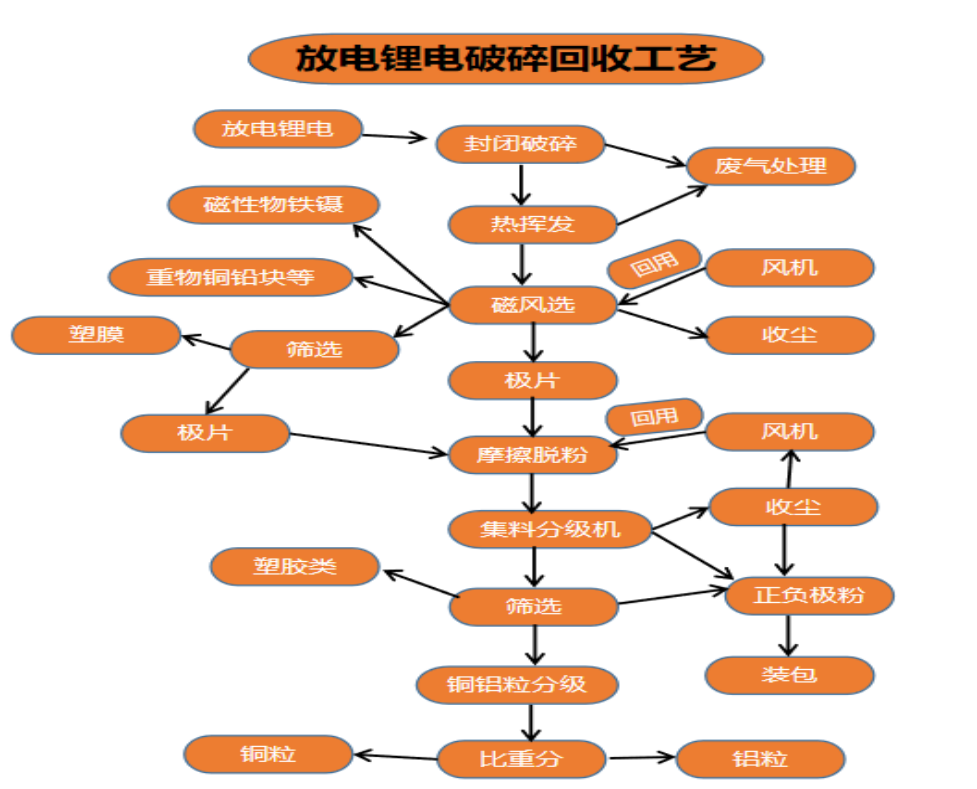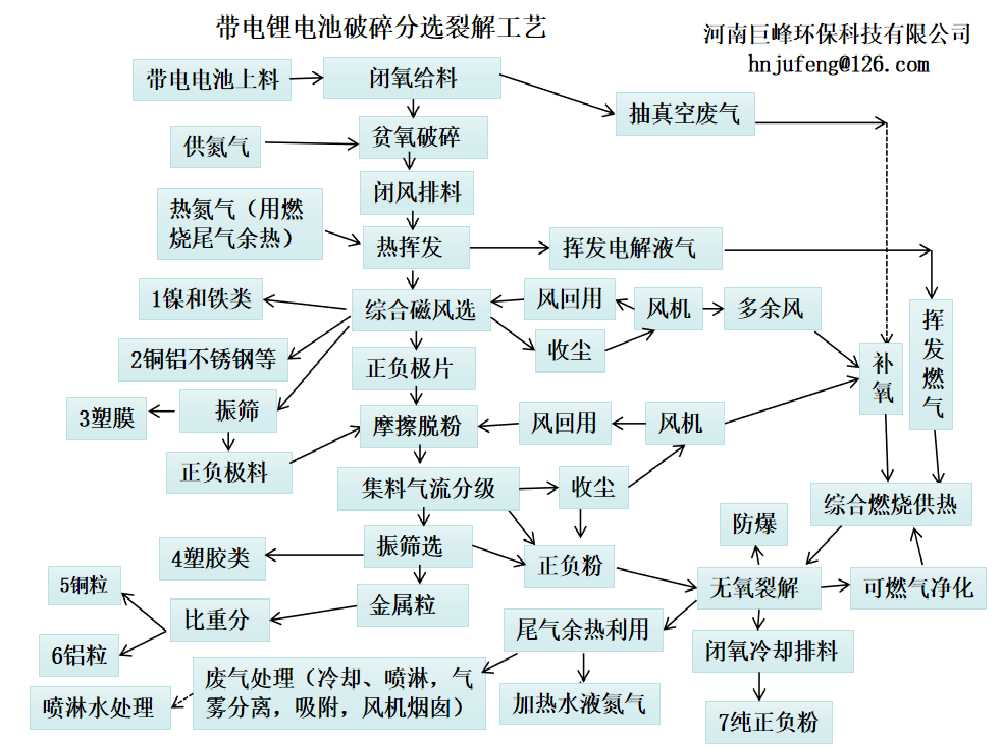 把鋰電放電后給料為封閉破機(jī)進(jìn)料, 碎后料進(jìn)加熱輸送進(jìn)行電解質(zhì)熱揮發(fā)把低于140度電解液進(jìn)行揮發(fā)(確保鋰電池放電到安全電壓1.3V以下,因高電壓使鋰電破碎料在熱揮發(fā)時(shí)產(chǎn)生有機(jī)氣體爆炸危險(xiǎn),并且盡量用惰性氣體進(jìn)行熱揮發(fā),盡量避免氧氣進(jìn)入,熱揮發(fā)氣體要單獨(dú)進(jìn)行輸送避免和其它含氧氣體混合產(chǎn)生爆炸隱患),揮發(fā)后物料經(jīng)過(guò)綜合分選把磁性物鐵鎳,塑膜、較重金屬極塑膠和正負(fù)極片,正負(fù)極片進(jìn)摩擦脫粉再進(jìn)行氣流風(fēng)選和篩選,把金屬粒和極粉分離,銅鋁經(jīng)過(guò)篩選和比重分選進(jìn)行分離,生產(chǎn)各處產(chǎn)生的廢氣經(jīng)各自管道進(jìn)行輸送至廢氣處理系統(tǒng)進(jìn)行達(dá)標(biāo)排放。