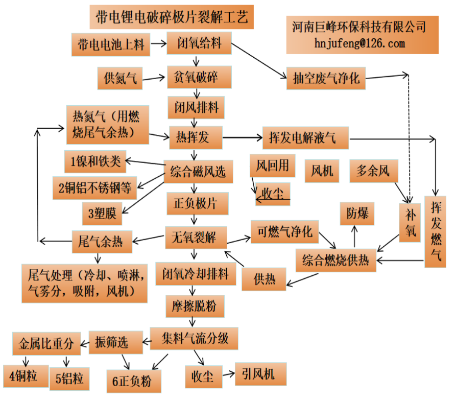 帶電鋰電池在惰性氣保護(hù)下貧氧破碎、閉風(fēng)排料、貧氧熱揮發(fā)、磁風(fēng)選等工序,把鐵、塑殼、不銹鋼、銅鋁、塑膜分選出,揮發(fā)電解氣進(jìn)燃燒系統(tǒng)燃燒處理,分出極片進(jìn)裂解爐,可燃?xì)膺M(jìn)燃燒系統(tǒng)供熱,裂解后極片經(jīng)冷卻、摩擦脫粉、篩選、比重分、除塵等工序?qū)O粉,銅粒,鋁粒分離;燃燒尾氣經(jīng)冷卻、堿噴淋、水噴淋、氣霧分離和吸附過(guò)濾外排。