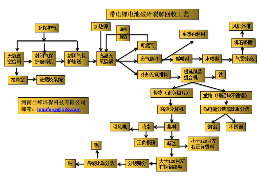 帶電鋰電進(jìn)貧氧破碎,送至惰性保護(hù)氣輸送,把破碎后的物料直接進(jìn)無(wú)氧裂解系統(tǒng),帶電鋰電加熱在爐內(nèi)放電發(fā)熱電能二次利用,同時(shí)對(duì)電解質(zhì)、塑膜、塑膠和粘合劑等有機(jī)物進(jìn)行裂解,裂解產(chǎn)生的可燃?xì)鈨艋髮?duì)爐供熱,裂解后物料冷卻磁選風(fēng)選后把鐵、鎳、鋁塊、銅塊、不銹鋼分選出,再把分選出裂解極片經(jīng)摩擦脫粉篩選分級(jí),進(jìn)行把極粉和金屬顆粒分離,金屬顆粒再經(jīng)過(guò)分級(jí)比重分選進(jìn)行銅鋁分離。燃燒尾氣經(jīng)過(guò)冷卻噴淋,水汽分離和吸附進(jìn)行達(dá)標(biāo)排放.