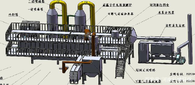 高溫?zé)峤膺^程中會(huì)產(chǎn)生熱解氣及熱解油(氣態(tài)),主要成分為短鏈烯烴及酯類有機(jī)物,收集熱解得到的熱解氣、油,添加一定比例燃?xì)廨o助燃燒,燃燒溫度1100℃、3S,釋放的熱量可供物料干燥等輔助供熱,尾氣經(jīng)凈化處理達(dá)標(biāo)排放。