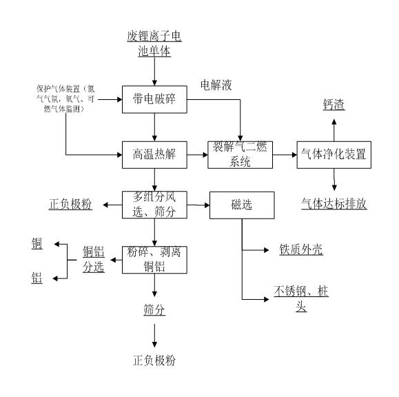 廢舊鋰電池單體破碎分選技術(shù)工藝流程整體工藝采用單體帶電的鋰電池破碎、高溫?zé)峤?、多組分篩分分選、銅鋁分選工藝,各組分物料回收率可達(dá)95%以上,極粉純度達(dá)95%-98%。該流程生產(chǎn)線可以處理三元?jiǎng)恿︿囯姵丶傲姿徼F鋰電池,通過物理分選方法,實(shí)現(xiàn)鋰電池有價(jià)金屬高效回收,產(chǎn)品為廢舊鋰電池中的樁頭、外殼、正負(fù)極集流體、正負(fù)極粉材料。