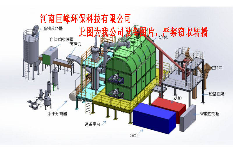 無(wú)氧裂解系統(tǒng)性中產(chǎn)生的可燃?xì)馀c破碎分選產(chǎn)生的廢氣進(jìn)行互補(bǔ),在燃燒室中充分燃燒,達(dá)到廢氣相互燃燒和充分利用,使燃燒后的尾氣處理比較簡(jiǎn)單。
