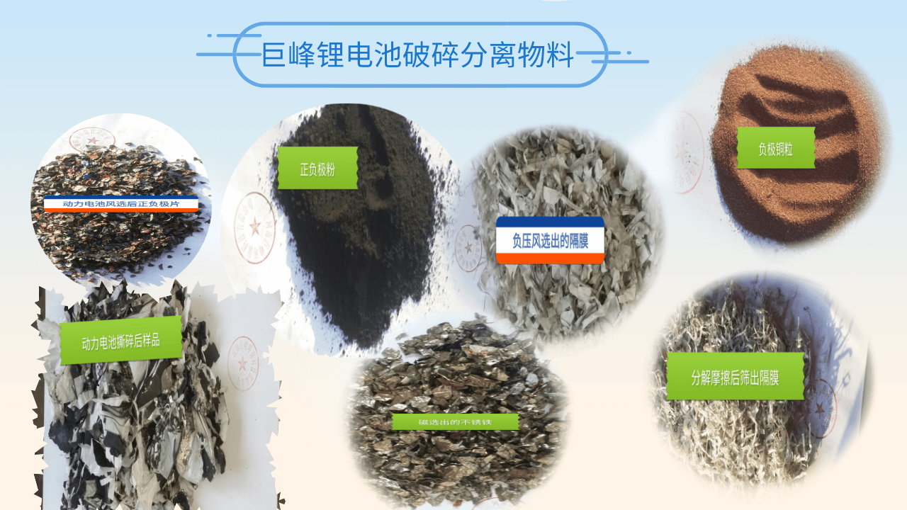 1)用途:1.將帶電的廢舊電池芯,正極片經(jīng)過剪切破碎。碎電芯與廢三元類正極片一起經(jīng)過高溫?zé)峤?、分選、剝離等處理工序分離出正負(fù)極粉、鋁片、銅片、外殼。
